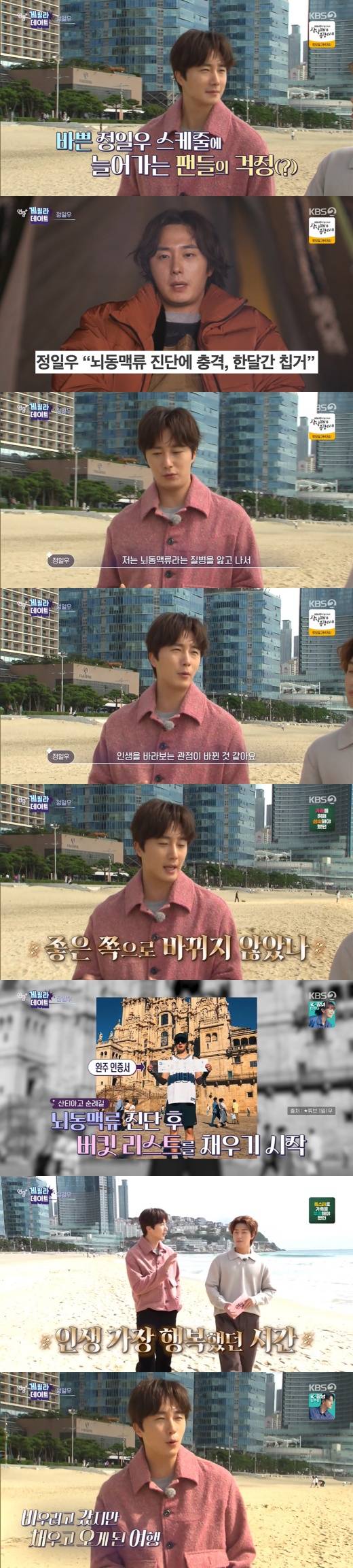 특히 산티아고 순례길을 완주하는 등 버킷리스트를 채워 화제를 모은바. 정일우는 "현재를 즐기고 해보고 싶은 걸 다 해보자 생각하고 떠났는데 제 인생에 가장 행복했던 시간이었다. 비우려고 갔는데 더 많은 것을 얻어 온 시간이었다"라며 "병 때문에 제 인생이 많이 좋은 쪽으로 바뀌었다"고 긍정적인 마음가짐을 드러냈다.