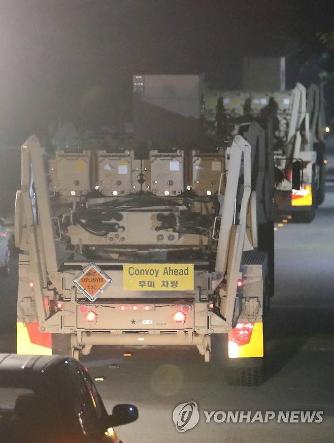 (성주=연합뉴스) 김현태 기자 = 6일 오후 사드(THAAD·고고도미사일방어체계)기지 입구인 경북 성주군 초전면 소성리 마을회관 앞 도로에 사드 기지로 들어가는 장비를 실은 군용차량이 지나가고 있다. 2022.10.6