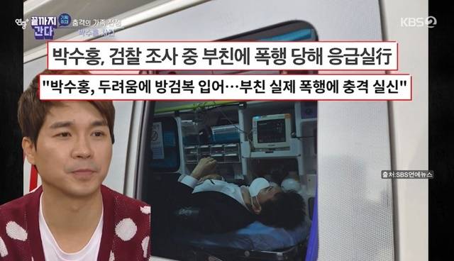 박수홍이 4일 화요일 검찰 조사 중 부친에게 폭행당해 응급실 후송됐다는 보도가 있었다. 박수홍 변호사는 “오늘 대질조사 일정이 있었다. 대질 조사를 시작하려는 순간 아버지가 갑자기 왜 인사 하지 않느냐는 이유로 정강이를 걷어차고 박수홍이 왜 때리느냐고 하니까 아버지가 ‘어디 버르장머리 없이 흉기로 XX겠다’고 하셨다”고 당시 상황을 전했다.