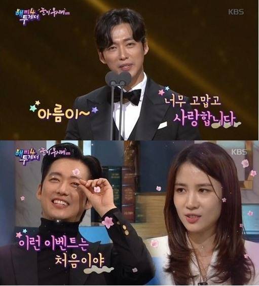 "아름이 고맙고 사랑해"는 남궁민의 수상소감 마침표를 장식해왔다. 시상식 첫 언급은 '2017 KBS 연기대상'. 남궁민은 이날 '김과장'으로 최우수상을 수상했다. . 남궁민은 "아무 이유 없이 저를 사랑해주는 가족들 사랑한다"며 동생의 이름 등을 차례로 언급한 후 "그리고 (진)아름이 정말 고맙고 사랑합니다"고 말했다.
