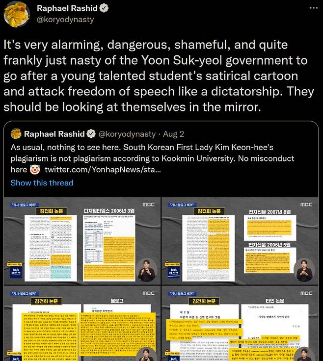 라시드는 범학계 검증단에서 심각한 수준의 표절이라는 결론을 낸 대통령 부인 김건희 여사의 국민대 박사학위 논문 표절 비교 이미지를 함께 링크한 뒤, ”정부는 거울에 비친 스스로를 돌아봐야 한다“는 지적도 덧붙였다.