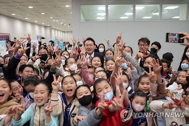 (울산=연합뉴스) 서명곤 기자 = 윤석열 대통령이 7일 오후 울산종합운동장에서 열린 제103회 전국체육대회 개회식에서 애국가를 부른 어린이 합창단원들과 기념촬영을 하고 있다. 2022.10.7 [대통령실 제공. 재판매 및 DB금지]