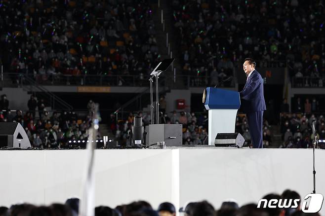(서울=뉴스1) 안은나 기자 = 윤석열 대통령이 7일 오후 울산종합운동장에서 열린 제103회 전국체육대회 개회식에서 기념사를 하고 있다. (대통령실 제공) 2022.10.7/뉴스1