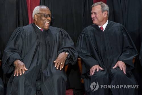 epa10229086 Chief Justice of the United States John G. Roberts, Jr. (R) talks with Supreme Court Associate Justice Clarence Thomas (L) during an official group portrait in the East Conference Room of the Supreme Court in Washington, DC, USA, 07 October 2022. EPA/SHAWN THEW