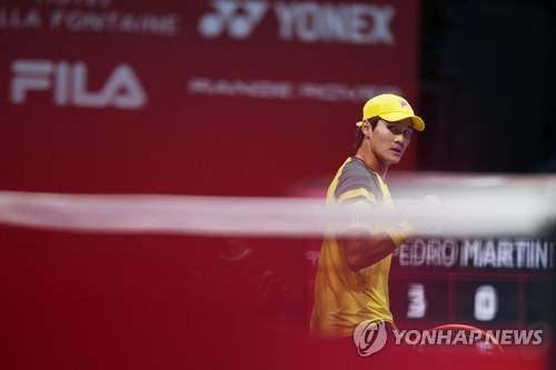 Kwon Soon-woo of South Korea reacts after gaining a point against Pedro Martinez of Spain in a quarterfinal match of the Rakuten Open tennis tournament in Tokyo, Friday, Oct. 7, 2022. (AP Photo/Hiro Komae) RETRANSMISSION FOR BETTER COLOR TONING AND CROPPING