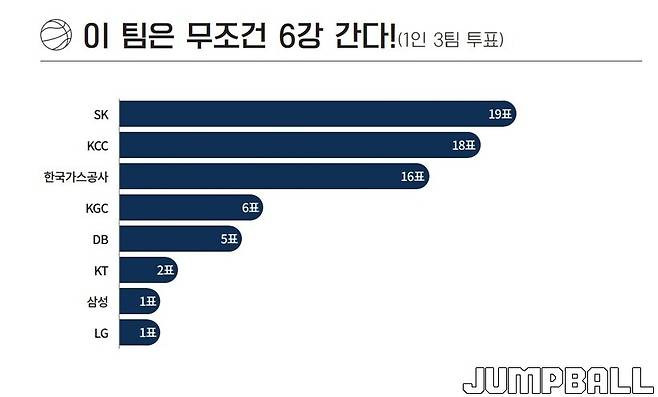 ‘무조건PO 갈팀’ 3팀을 꼽아달라는 설문에는 우승후보로 가장 많은 표를 받은 SK, KCC, 가스공사가 나란히 1~3위를 차지했다. 설문자 대부분이 약속이라도 한 듯이 SK, KCC, 가스공사를 손꼽았다. 세 팀은 거의 패키지나 마찬가지였을 정도다.