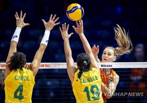 epa10229456 Nika Daalderop (R) of the Netherlands in action against Brazilian players Carolina Da Silva Ana (L) and Tainara Lemes Santos (C) during the 2022 Volleyball Women's World Championship second round match between the Netherlands and Brazil in Rotterdam, Netherlands, 07 October 2022. EPA/Koen van Weel