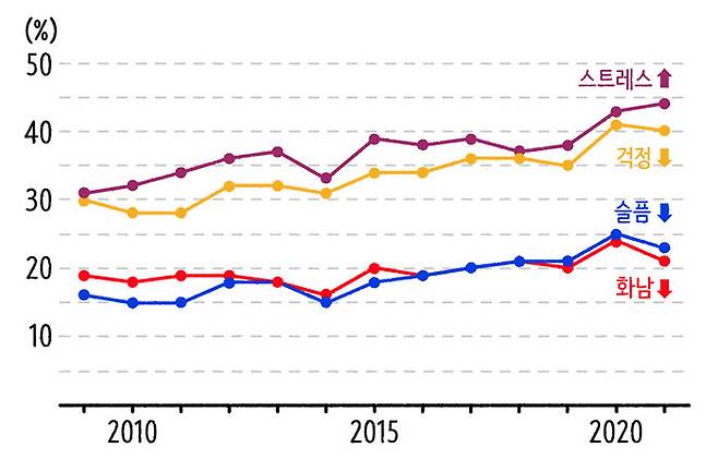 그렇다면 지금 우리들은 어떤 상황에서 일을 하고 있는 걸까요? 갤럽에서 전 세계 96개국의 11만 2,312개의 기업, 2,708,538명의 직장인을 대상으로 일에 대한 기쁨과 슬픔을 물어봤습니다. 그 결과는? 2021년 전 세계의 직장인들이 업무로 받는 스트레스 비율은 2009년 조사 이후 사상 최고치였어요. 업무 스트레스를 받는다고 대답한 사람들은 모두 44%. 2021년 조사에서 나머지 부정적 감정 표현인 걱정, 화, 슬픔의 비율은 지난 조사보다 모두 감소했지만 스트레스 비율만 유일하게 증가했습니다.