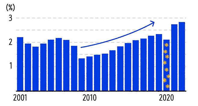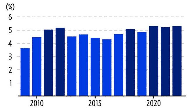 이번엔 조금 더 정교하게 조사된 데이터로 살펴볼게요. 미국의 퇴직률 데이터를 살펴봤던 노동통계청의 JOLTS 데이터에 해당하는 우리나라의 사업체노동력조사라는 데이터가 있습니다. 고용노동부에서 월마다 진행하는 이 조사를 보면 월마다 얼마나 많은 사람들이 이직을 했는지 그 규모와 비율을 확인할 수 있죠. 월별 이직률을 살펴보면 미국처럼 뚜렷한 상승세가 보이진 않습니다. 연도별로 평균을 내보면 어떨까요? 아래 그래프가 우리나라의 연도별 평균 이직률인데, 월별과 마찬가지로 추세가 명확하지는 않지만 2020년 이후 올해까지 3년 연속으로 연평균 5%를 넘기고 있다는 건 주목할 만합니다.