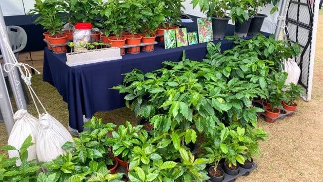 체험존 옆에는 커피 체리나무 묘목을 판매하는 부스도 있었다. 현장 관계자는 “커피나무에 핀 흰 꽃은 시간이 지나면 초록색 열매로 변한다”며 “이것이 붉은 색의 커피 체리로 숙성되고, 체리를 반으로 가르면 생두가 나온다”고 설명했다.