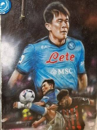 이탈리아 매체 일마티노는 8일(한국시간) 나폴리 시내에 등장한 김민재의 벽화를 소개했다. 이탈리아의 예술가 히메네즈가 그린 것으로 알려진 벽화에는 김민재의 모습과 함께 김민재가 지난달 18일 열린 AC밀란전에서 남긴 인상적인 장면이 표현되어 있다.