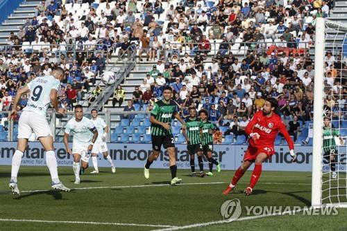 epa10230847 Inter's Edin Dzeko (L) scores the 1-2 goal during the Italian Serie A soccer match US Sassuolo vs FC Inter at Mapei Stadium in Reggio Emilia, Italy, 08 October 2022. EPA/ELISABETTA BARACCHI