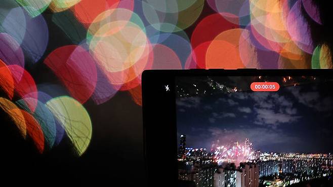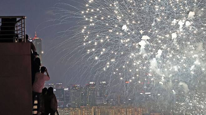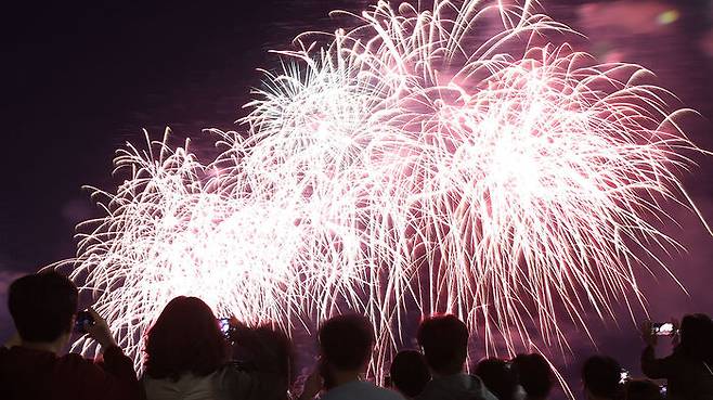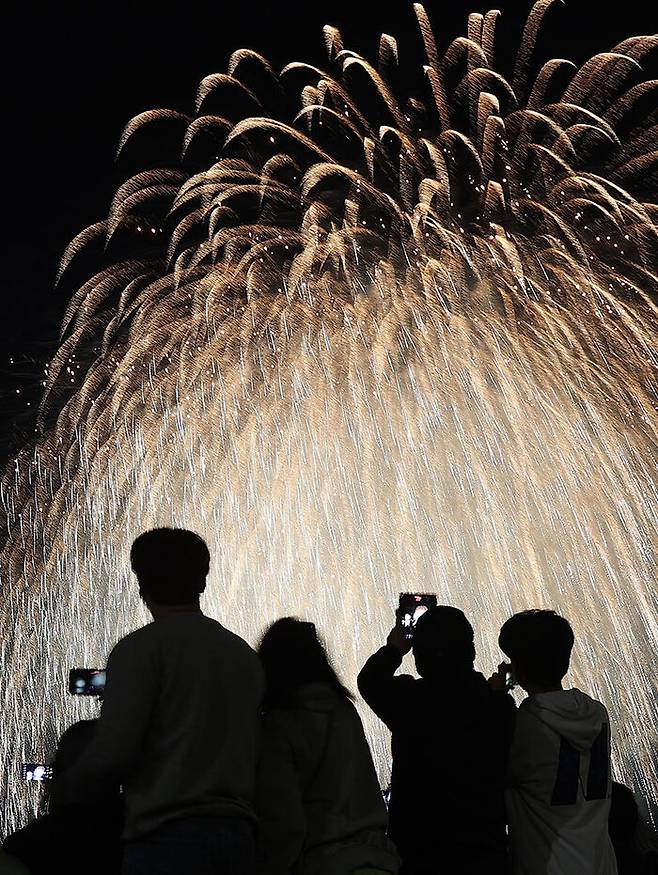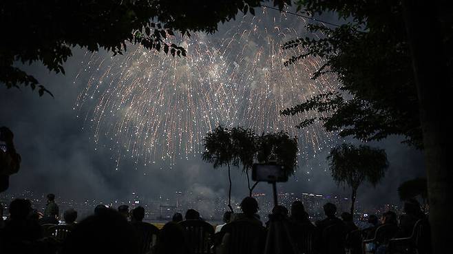 불꽃쇼를 스마트폰으로 촬영하고 있는 시민들