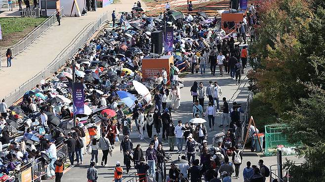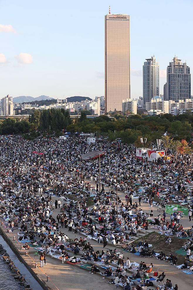 서울세계불꽃축제가 3년 만에 개최되는 8일 오후 서울 여의도 한강공원이 시민들로 붐비고 있다.