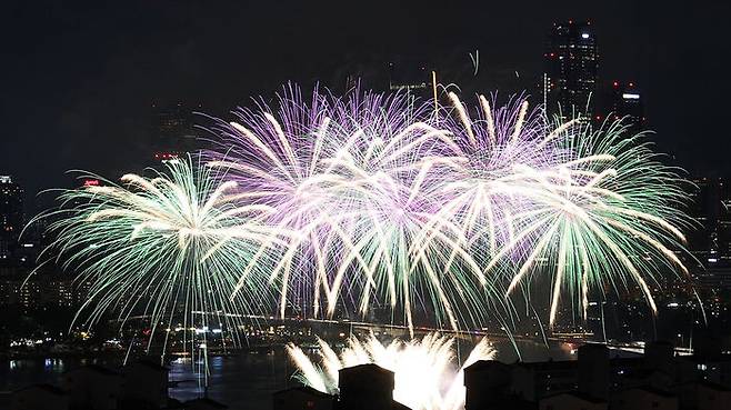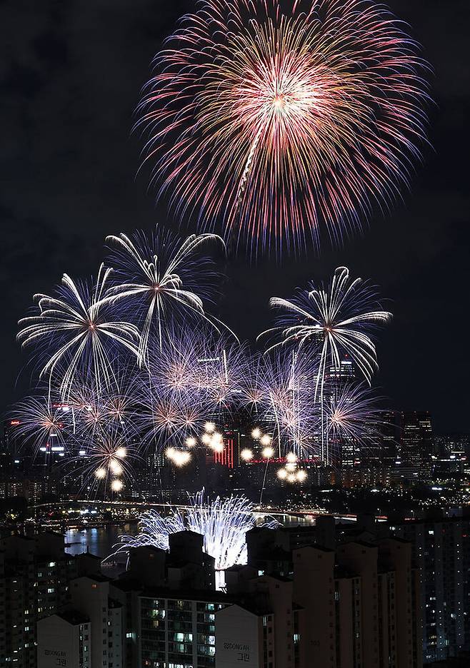 8일 오후 서울 여의도 한강공원 일대에서 열린 '한화와 함께하는 서울세계불꽃축제 2022'에서 화려한 불꽃이 밤하늘을 수놓고 있다. 3년 만에 열리는 이번 행사의 주제는 '위 호프 어게인(We Hope Again)'이다. 코로나19로 지친 일상을 위로하고 다시 꿈과 희망의 불꽃을 쏘아 올린다는 의미다.