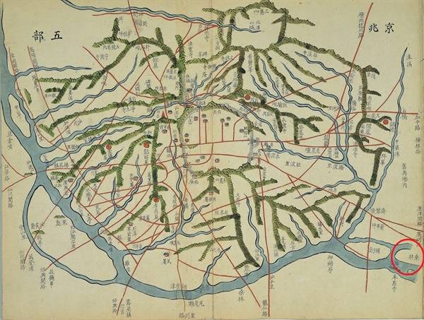 | ▲ 경조오부도에 나온 잠실 김정호가 만든 지도 <동여도>의 '경조오부도'. 빨간 원에 '상림' 즉 뽕나무숲이 표시되어 있다. 지금의 잠실이다. |