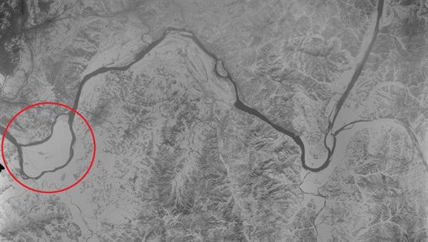 | ▲ 1969년에 촬영한 잠실섬 일대의 항공사진 빨간 원은 잠실로 1971년 이전에는 한강의 섬이었다. 섬 북쪽으로 흐르는 강을 신천강으로, 남쪽으로 흐르는 강을 송파강으로 불렀다. |