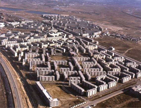 | ▲ 잠실주공아파트단지 전경(1976) 좌측 상단에 석촌호수가 보인다. 당시 호수 주변은 허허벌판이었다. |