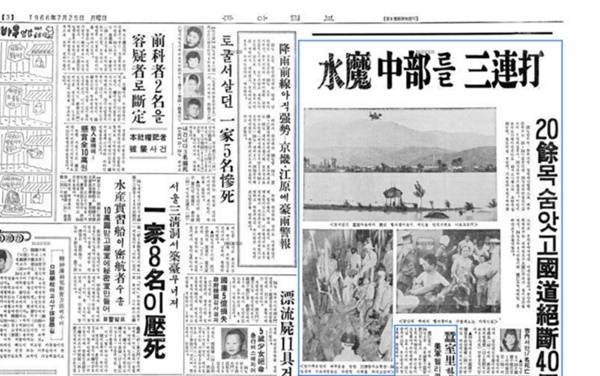 그 일례로, <동아일보> 1966년 7월 25일 '잠실리 한때 고립' 기사는 한강물이 불어나 고립된 성동구 신천동과 잠실동 주민 1400여 명이 구조되었다고 전한다. 처음에는 선박으로 구출하다가 물살이 거세지자 미군에 헬기를 요청했다고. 같은 신문 7월 27일 기사에는 미군이 선박 6척과 헬기 3대를 동원해 잠실섬 등에서 주민들을 구조했다고 전한다.