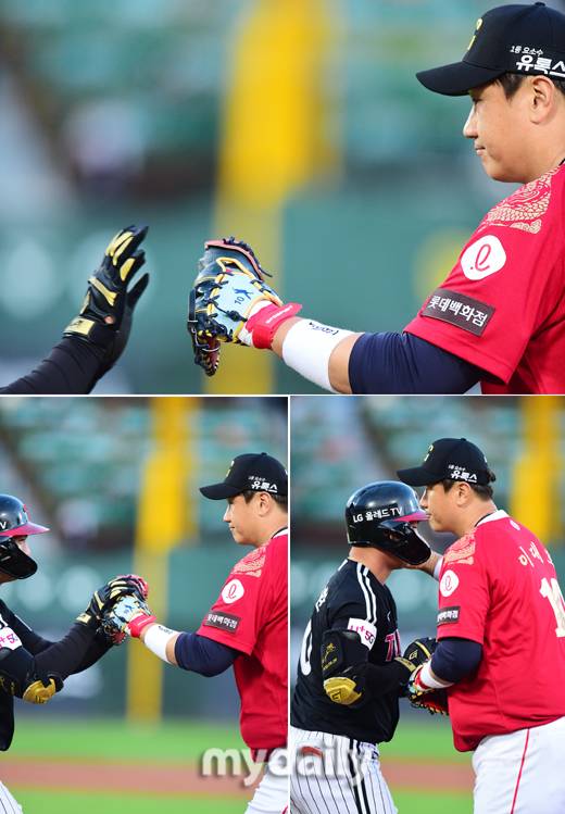 1루 베이스 앞까지 달려온 오지환은 글러브를 뻗고 있던 이대호에게 두 손을 올리며 셀프 태그를 했다. 이대호는 오지환과 살짝 포옹을 하며 다시 한 번 고마움을 표현했다.