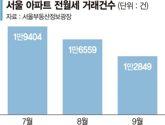 전세물건은 증가했지만 거래 건수는 오히려 줄었다. 서울부동산정보광장에 따르면 서울아파트 전월세 거래건수는 지난 7월 1만9404건, 8월 1만6559건, 9월 1만2849건으로 3개월 연속 감소세다.
