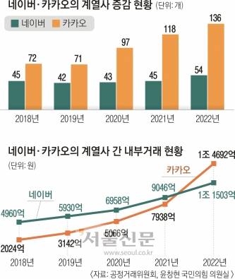 국내 양대 포털 플랫폼 운영사인 네이버와 카카오가 지난해 계열사와 각각 1조원대 내부거래를 한 것으로 드러났다. 내부거래 규모는 4년 새 네이버는 2배, 카카오는 7배 수준으로 늘었다. 기업집단 내부거래 자체가 불법은 아니지만 두 ‘공룡 플랫폼’이 경쟁 촉진과 상생을 뒤로하고 계열사 배 불리기에 나섰다는 비판이 제기된다.