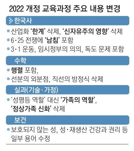 정권이 바뀔 때마다 도마에 오른 고등학교 한국사 과목에서는 기존 ‘6·25 전쟁’이라는 문구를 ‘남침으로 시작된 6·25 전쟁’으로 바뀐다. 또한 산업화의 성과와 한계에서 ‘한계’를 빼고, 신자유주의가 미친 영향과 문제에 관한 서술도 삭제하기로 했다. 성평등과 관련해서는 ‘성평등’, ‘성인지 감수성’ 등의 단어를 삭제해 달라는 요구에 따라 ‘성평등 역할’ 문구를 ‘가족의 역할’로 수정하고, ‘정상가족 신화’라는 문구도 뺀다. 국악 홀대론 등 논란으로 절충안을 못 낸 음악은 오는 14일까지 의견을 받는다.