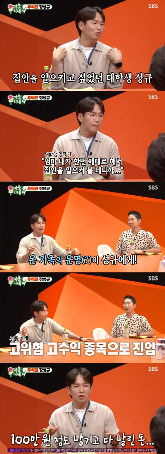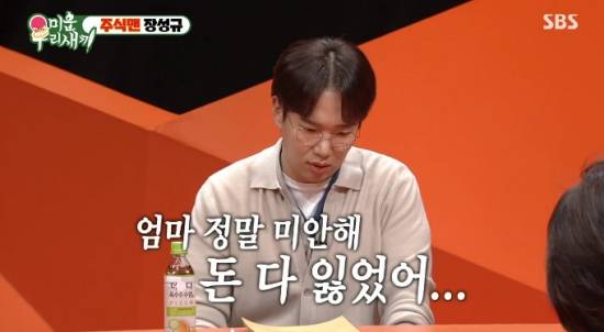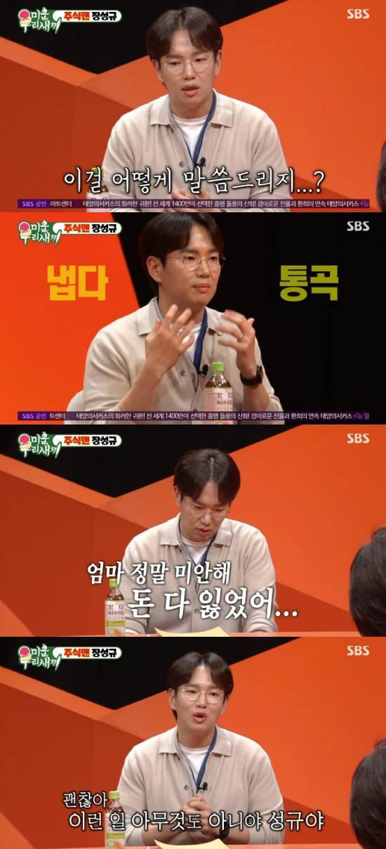 9일 방송된 SBS '미운 우리 새끼'에서는 장성규가 스페셜 게스트로 출연한 가운데 부모님의 전 재산을 주식에 투자한 경험을 밝힌 장면이 전파를 탔다.