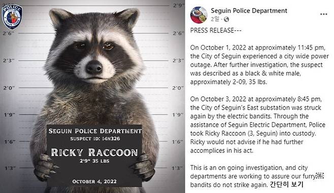 현지 시간으로 지난 5일 미국 텍사스주 세귄경찰서는 공식 SNS에 "지난 3일 밤 8시 45분, 동부변전소가 '전기강도'들에 의해 또 공격받았다"며 "당국의 도움을 받아 경찰은 리키 라쿤(Ricky Raccoon, 3)을 연행했다"고 밝혔습니다.