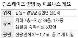 돈 냄새를 맡은 디벨로퍼들은 양양에 잇달아 호텔을 올리고 있다. 지난해 낙산도립공원 해제 이후 직선거리 약 2㎞의 낙산해수욕장 해변은 '천지개벽' 중이다. 줄잡아 7~8곳에 달하는 필지에서 호텔 공사가 한창이다. 이 중 '인스케이프 양양 바이(by) 파르나스'는 '럭셔리'로 차별화 포인트를 내건 사업장 중 하나다. 이 단지는 양양군 강현면 전진리에 들어서는 지하 7층~지상 39층, 1개 동 생활형 숙박시설 393실이다. 전용면적 37~151㎡에 걸쳐 총 21개 평면으로 이뤄졌다. 피데스개발이 시행을, 시공은 대우건설이 각각 맡았다.