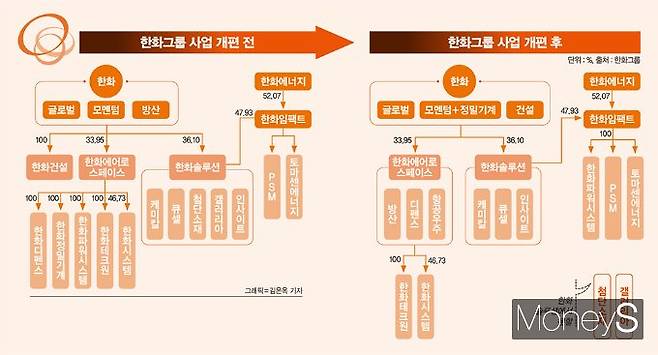 방산 사업과 관련해선 한화에어로스페이스가 ㈜한화 방산 부문을 인수하고 한화디펜스를 흡수합병한다. 흩어져 있던 방산 사업을 통합해 지상에서부터 항공우주에 이르는 종합 방산 기업을 만들겠다는 목표다. 한화그룹이 대우조선해양 인수를 마무리하면 한화에어로스페이스는 육·해·공 통합 방산시스템을 갖추게 된다. 대우조선해양의 액화천연가스(LNG) 해상 생산 기술과 한화큐셀 태양광 사업 등을 결합시키면 친환경 에너지 밸류 체인도 구축할 수 있다. 김 부회장이 맡고 있는 두 사업 부문(태양광·방산)의 시너지를 노릴 수 있는 셈이다.