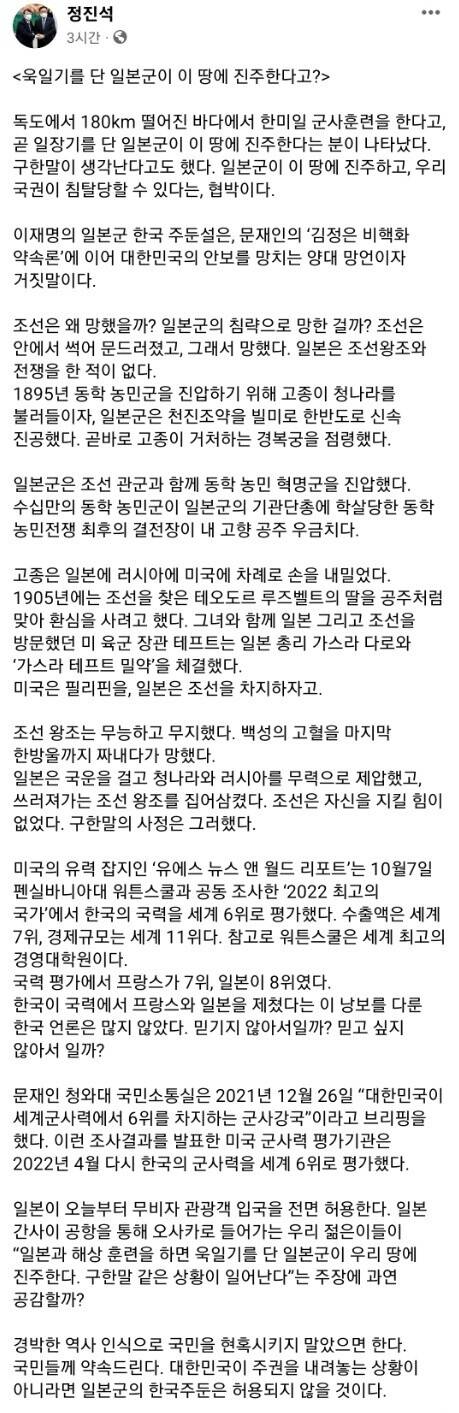정 비대위원장은 이날 페이스북에 올린 글에서 이재명 더불어민주당 대표가 한·미·일 합동 군사훈련을 반대하며 “욱일기가 다시 한반도에 걸리는 일이 실제로 생길 수 있다”고 말한 것에 대해 “경박한 역사 인식으로 국민을 현혹시키지 말라”며 이렇게 말했다. 그는 이와 관련 “조선 왕조는 무능하고 무지했다. 백성의 고혈을 마지막 한방울까지 짜내다가 망했다”며 “일본은 국운을 걸고 청나라와 러시아를 무력으로 제압했고, 쓰러져가는 조선 왕조를 집어삼켰다. 조선은 자신을 지킬 힘이 없었다”고 썼다.