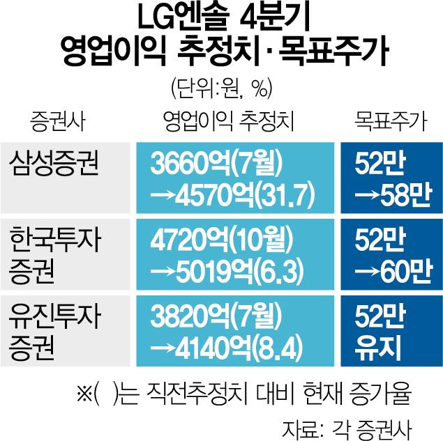 이에 증권사들은 LG엔솔의 4분기 실적 눈높이를 올려 잡고 목표주가도 함께 상향 중이다.