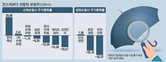 11일 한국거래소에 따르면 보험지수는 올해 들어 4.73% 하락하는 데 그치며 같은 기간 26.38% 떨어진 코스피에 비해 하락폭이 작았다. 보험지수는 삼성생명, 삼성화재 등 생명·손해보험사 시가총액 상위 10곳을 추종한다. 시장이 급변하고 있는 이달 들어 5거래일 동안 보험지수는 1.91% 상승했다. 보험주의 특성상 채권 등 안전자산에 투자된 자산이 많고, 이는 결국 금리 인상기에 수익이 나아질 수 있다는 것이다. 고객들에게서 받은 보험금을 운용하는 보험사는 금리가 오르면 투자수익률이 높아져 실적이 개선된다는 것이 일반적인 평가다.