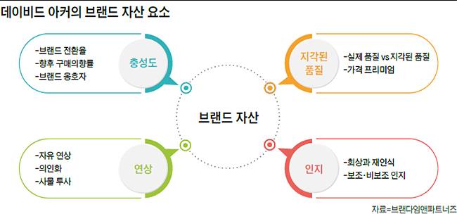 힘 있는 브랜드를 우리는 강력한 브랜드 자산이 구축된 브랜드라고 표현한다. 브랜드 분야의 세계적 석학 데이비드 아커(David Aaker)는 브랜드 자산을 구성하는 요소로 인지, 연상, 지각된 품질, 충성도를 꼽았다. 그의 이론에 따르면, 브랜드가 힘이 세지려면 ‘안다, 들어 봤다→강력하게 떠오르는 게 있다→왠지 좋아 보인다→고집하게 된다’의 순차적인 과정을 거쳐야 한다. 출발은 인지와 연상이다. 브랜드 자산의 구성 요소는 학자마다 다르게 정의되지만 ‘인지도’와 ‘이미지’는 모든 이론에서 공통으로 거론된다. 얼마나 많은 사람이 브랜드를 들어 봤는지, 알고 있는지, 떠올리는지를 알려주는 인지도와 사람들이 어떠한 연상을 통해 브랜드와 관계 맺고 있는지를 설명하는 이미지가 브랜드 자산의 두 가지 원천이다.