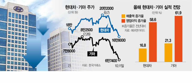 증권 업계에서는 현대차(005380)와 기아의 실적이 연일 신기록을 세우는 만큼 주가 급락 상황에 대해 과한 우려라고 평가했다.