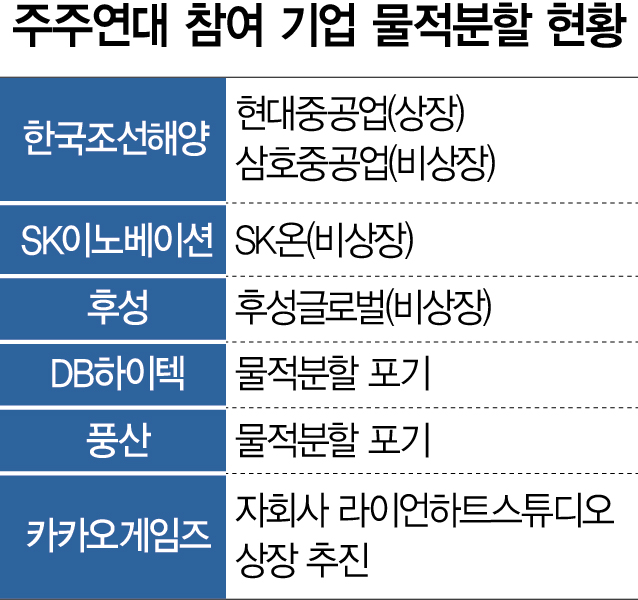 11일 금융투자업계에 따르면 개별회사마다 물적 분할에 대응하기 위해 만들어진 소액주주연대들이 몸집을 키우기 위해 최근 통합됐다. 공식 단체명은 ‘물적분할반대주주연합’이다. 최근 물적 분할을 추진하다가 된서리를 맞은 DB하이텍·풍산의 소액주주들에 더해 한국조선해양(009540)·SK이노베이션(096770)·후성(093370)의 주주들이 참여했다. 자회사인 라이언하트스튜디오의 상장을 준비하고 있는 카카오게임즈(293490) 역시 최근 추가됐다. 이날 기준 주주연합 참여 주주들은 1900명을 웃돌고 있다.