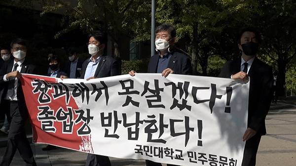 국민대 연구윤리위원회가 검증 시효 경과를 이유로 김여사의 논문 본조사를 하지 않자, 김여사의 논문 검증을 촉구하는 졸업생 200여 명이 학교 졸업장을 반납하기로 했다. 김준홍 국민대 동문 비상대책위원장은 "36년 만에 졸업한 동문께서 '학교가 이렇게 비겁하게 나온다면 이런 학교의 졸업장과 간판은 필요 없다' 이렇게 메일을 보내실 정도"라고 밝혔다. 학교 앞에서는 대학 측의 논문 재조사를 촉구하며 재학생의 1인 시위도 진행됐다. 그리고 작년 10월 교육부는 국민대에 김여사 논문에 대한 입장 및 조사 계획서를 제출하라고 요구하자, 국민대는 김여사의 논문 표절 의혹에 대해 재조사에 들어가, 지난 8월 해당 논문들은 표절이 아니라고 공개한 것.