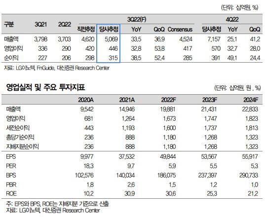 대신증권은 LG이노텍의 3분기 영업이익이 컨센서스를 상회한 4457억 원을 기록할 것으로 추정했다. 매출은 5조700억 원으로 컨센서스를 12.4% 가량 상회해 애플의 프리미엄 전략 변화에 직접적인 수혜를 볼 것으로 판단했다. 4분기 매출은 7조1500억원으로 컨센서스를 16.3% 상회하는 등 기대 이상의 성장이 전망된다. 영업이익은 5703억 원으로 분기 기준 최고 매출 및 영업익이 전망됐다.