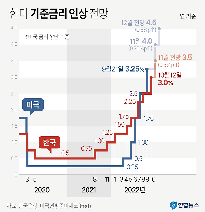이번 금리인상으로 기준금리가 3%됐는데요, 이창용 한국은행 총재는 기자회견에서 최종 기준금리 수준을 3.5% 수준으로 전망한다고 했네요. 이 총재는 기준금리가 연 3.5% 수준까지 오를 것이라는 시장 전망에 대해 "다수 위원이 말한 수준과 크게 다르지 않다"고 했는데요, 한은 금통위가 내년 초까지 0.50%포인트 추가 인상할 수 있다는 걸 내비친 셈이죠.