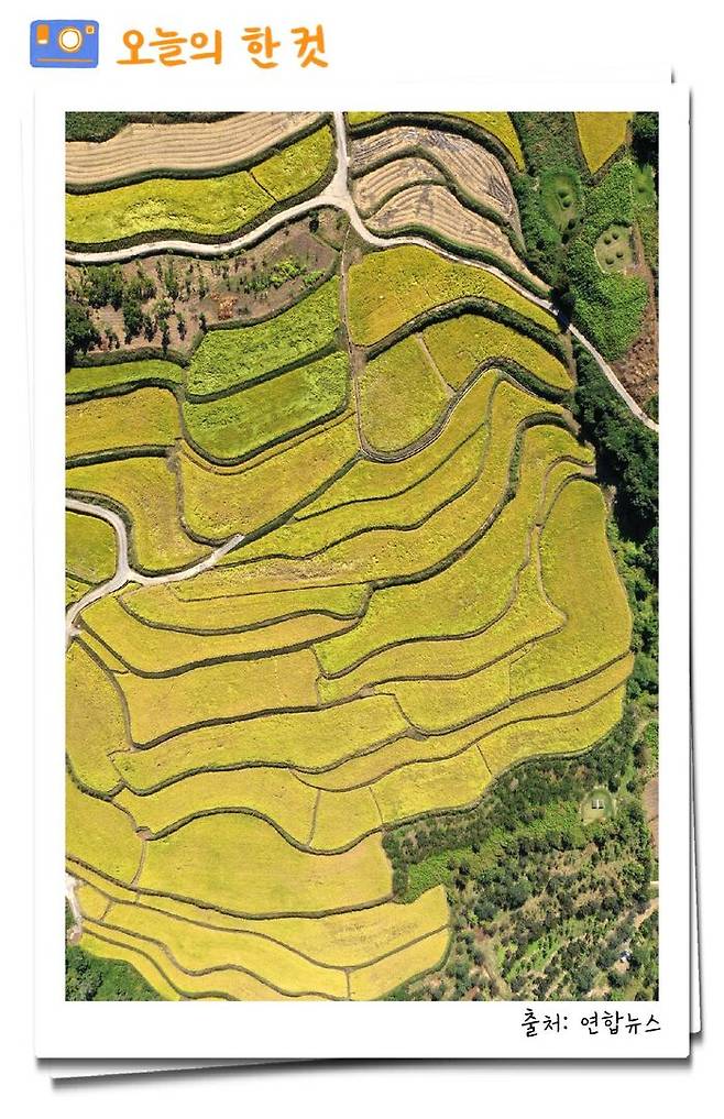 불규칙적인 경계선이 정감 어린 다랭이논(다랑논) 사진이에요. 전남 구례군 사포마을인데요, 벼가 익어 가을걷이를 앞두고 있네요.