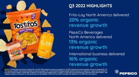 펩시코, 티커종목명 PEP은 개장 전 시장의 예상보다 좋은 실적을 내놓았습니다. 올해 전체 실적 전망도 높여잡았죠. 이 회사가 내놓은 3분기 실적은 매출 219억 7천만 달러, 주당순이익 1.96달러였습니다. 유럽 지역의 성장은 부진했지만 펩시코의 스낵 부문 자회사인 프리토레이가 북미 지역에서 20%대 매출 성장을 보이면서 실적을 견인했습니다. 러시아 지역 철수에 따라 14억 달러의 비용이 발생했지만 이익이 시장 예상보다 좋게 나온 점도 주목할 만하고요. 펩시코는 올해 매출 성장률 전망치를 기존 10%에서 12%로 상향했습니다. 펩시코의 주가는 프리마켓에서 2%대 상승했고요.