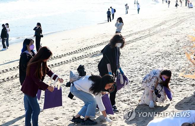 (부산=연합뉴스) 손형주 기자 = 13일 오후 부산 광안리해수욕장에서 방탄소년단(BTS) 부산 공연과 멤버 지민 생일을 축하하기위해 부산을 찾은 아미(BTS 팬)들이 비영리단체 EARHT SAVE가 주최한 플로깅(조깅·산책하며 쓰레기 줍기) 행사에 참여하고 있다. 2022.10.13