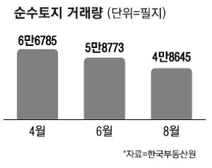 금리 인상과 건설자재 가격 상승으로 신규 부동산 개발사업이 주춤하면서 토지시장이 얼어붙고 있다. 토지 거래량은 줄고 지가 상승률도 둔화되고 있다. 13일 한국부동산원 지가 동향에 따르면 지난 8월 순수토지 매매 거래량은 4만8645필지로 집계됐다. 지난 3월(6만7155필지) 이후 5개월 연속 거래량이 줄어들었다. 2019년 9월(4만6338필지) 이후 최근 3년래 가장 낮은 수준이다. 순수토지는 건물이 딸린 부속토지가 아닌 맨땅을 뜻한다. 신규 부동산 개발사업 업황을 가늠할 수 있는 척도다.