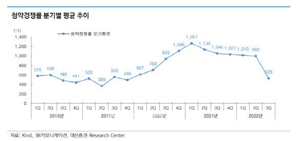 대신증권에 따르면 3분기 IPO 청약경쟁률은 526대 1을 기록하며 전 분기 대비 급감했다. 작년 청약경쟁률 연간 평균은 1117대 1에 달했다.