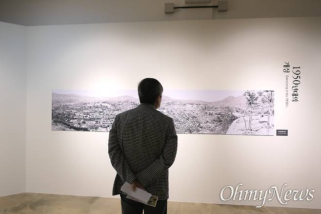 | ▲ 14일 전시관을 찾은 호수돈여중 1학년 학생 중 한명이 1957년 찍은 개성 시내 전경에서 호수돈학교 건물을 찾아 가리키고 있다. |