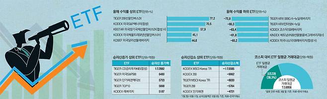 실제로 올해 하락장 속에서도 일부 ETF의 경우 70% 넘는 수익률을 기록했다. ETF는 주식처럼 상장돼 거래돼 주식과 펀드의 장점을 합친 상품으로 각광받고 있다. 올해 알짜 수익을 거둔 ETF와 자금이 몰린 주요 상품을 추려봤다.