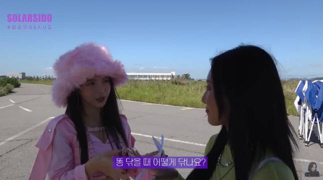 솔라는 “손톱이 이렇게 긴데 대변을 처리할 때 어떻게 닦나”라며 화사의 손톱을 보고선 “안돼, 각도가”라고 말해 웃음을 자아냈다. 이에 화사는 “여러분들이 오해하는 게 있다. 언니가 초짜라 그렇다. 언니는 솔직히 묻는다”며 장난스레 답했다.