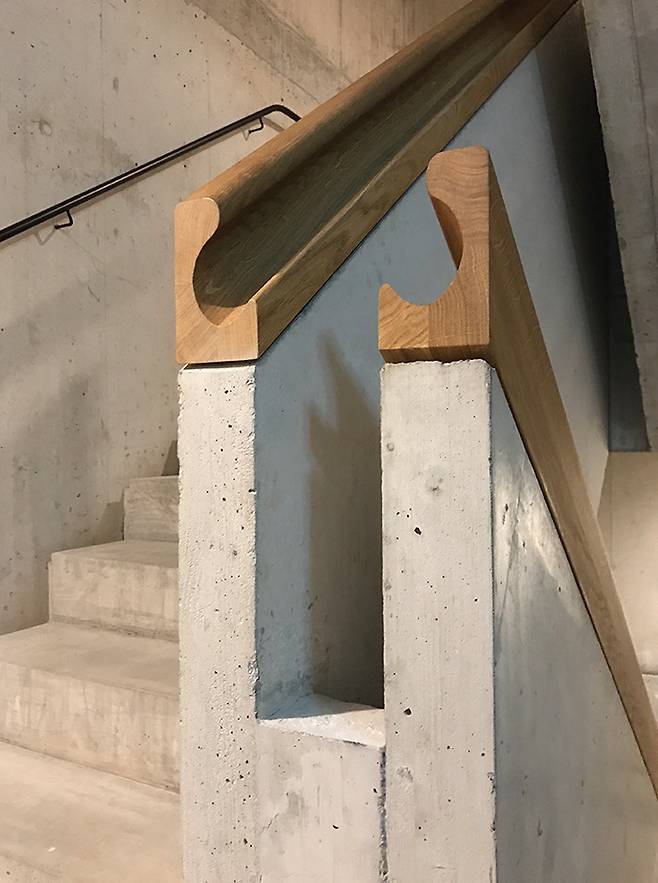 입면의 반복적인 사다리꼴 패턴은 창문과 드나드는 문이 되어 전체 파사드를 만들고 작게는 선홈통의 디자인이 되기도 한다. 도로에서는 눈에 띄지 않지만 강을 건널 때 비로소 정면을 보게 되는 이 건물은 간결한 요소 만으로 산책로의 인상을 얼마나 크게 바꿀 수 있는지 실험해 본 결과 같기도 하다.