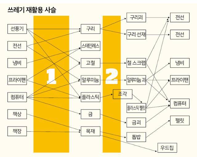 고물의 흐름은 생태계 물질 순환과 유사하다. 1차 고물상이 수집한 고물조각은 자원순환 단계의 상위 업체가 분류한 메뉴에 맞춰 판매된다. 예컨대 플라스틱은 PET, 폴리프로필렌, 폴리에필렌 등의 물질과 색깔로 구분해 전문 수지상에게 판매한다. 수지상은 매입한 플라스틱을 선별, 세척, 분리하고 잘게 쪼개서 얇은 조각(플라스틱을 잘게 쪼갠 형태)이나 펠릿(얇은 조각을 녹이고 길게 뽑아 작은 알갱이로 썬 형태)으로 만든다. 펠릿은 플라스틱 제조 공장으로 이동해 환생한다. 식품용기, 자동차, 전자제품 등이 된다. 종이는 수집한 폐지를 블록형태로 압축하는 파지압축장으로 이동하고, 여기서 만들어진 폐지블록은 제지업체로 보내져 재생종이나 골판지 박스가 되고, 택배상자로 옛 가정 집으로 돌아온다.